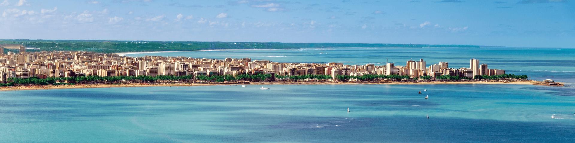 Maceió, capital do estado de Alagoas, é conhecida pelo seu mar de águas calmas de cor azul-turquesa e verde-esmeralda que se fundem harmoniosamente nas várias praias paradisíacas de areia branca e rodeadas por coqueiros.